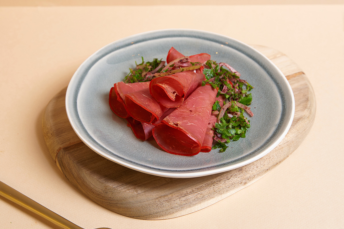Bastorma 11.00€ BASTORMA Tranche de bœuf fumé & séché aux épices d’Orient BASTURMA Slice of smoked and dried beef with oriental spices باستورما << Category: Mezzés froids