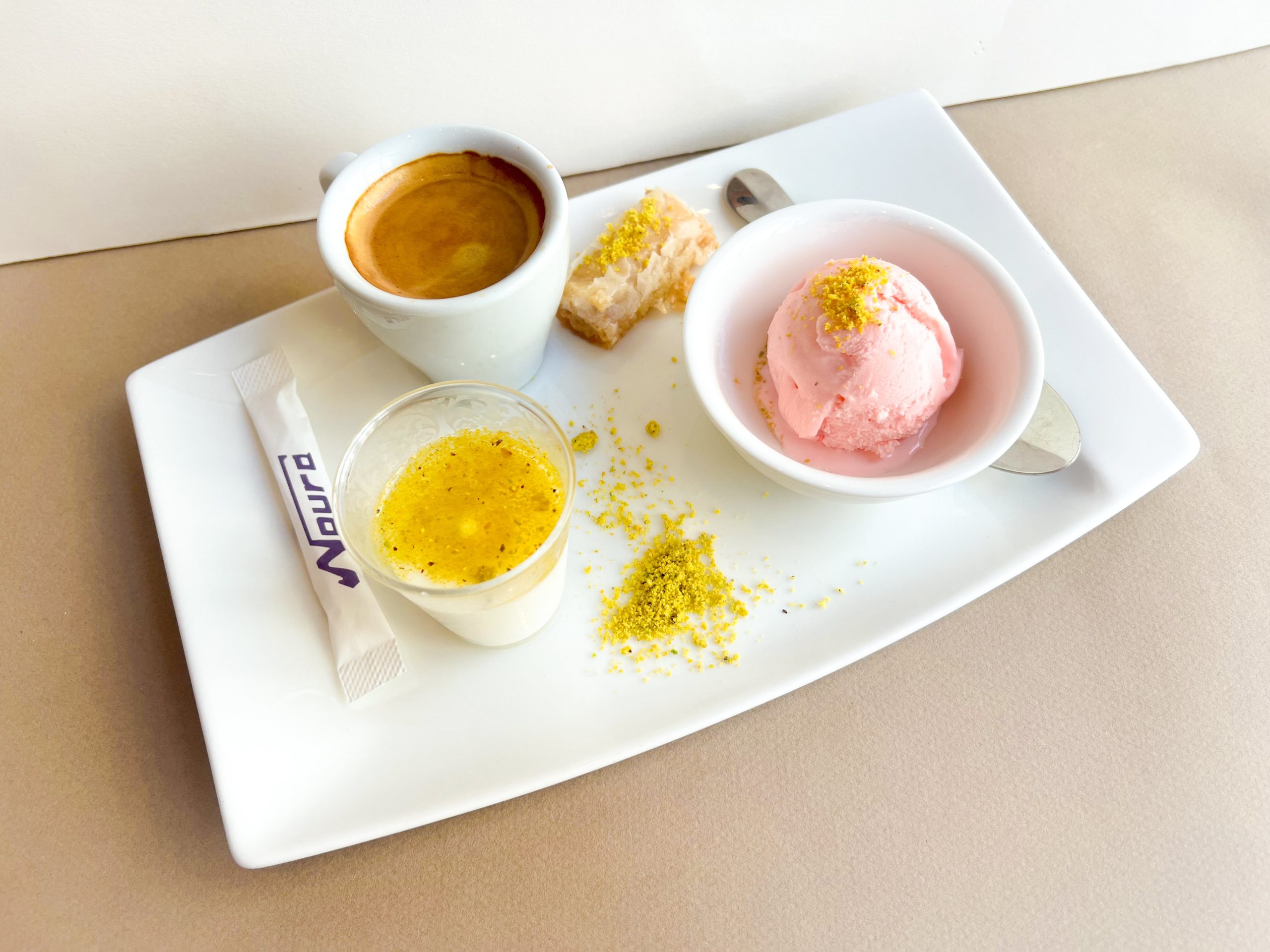 Coffee or mint tea, 1 piece of baklawa, 1 mouhallabieh verrine, 1 one scoop of rose or milk ice cream