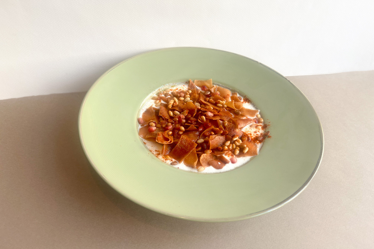 Eggplant with chickpeas, Lebanese bread, yogurt, tomato sauce and pine nuts