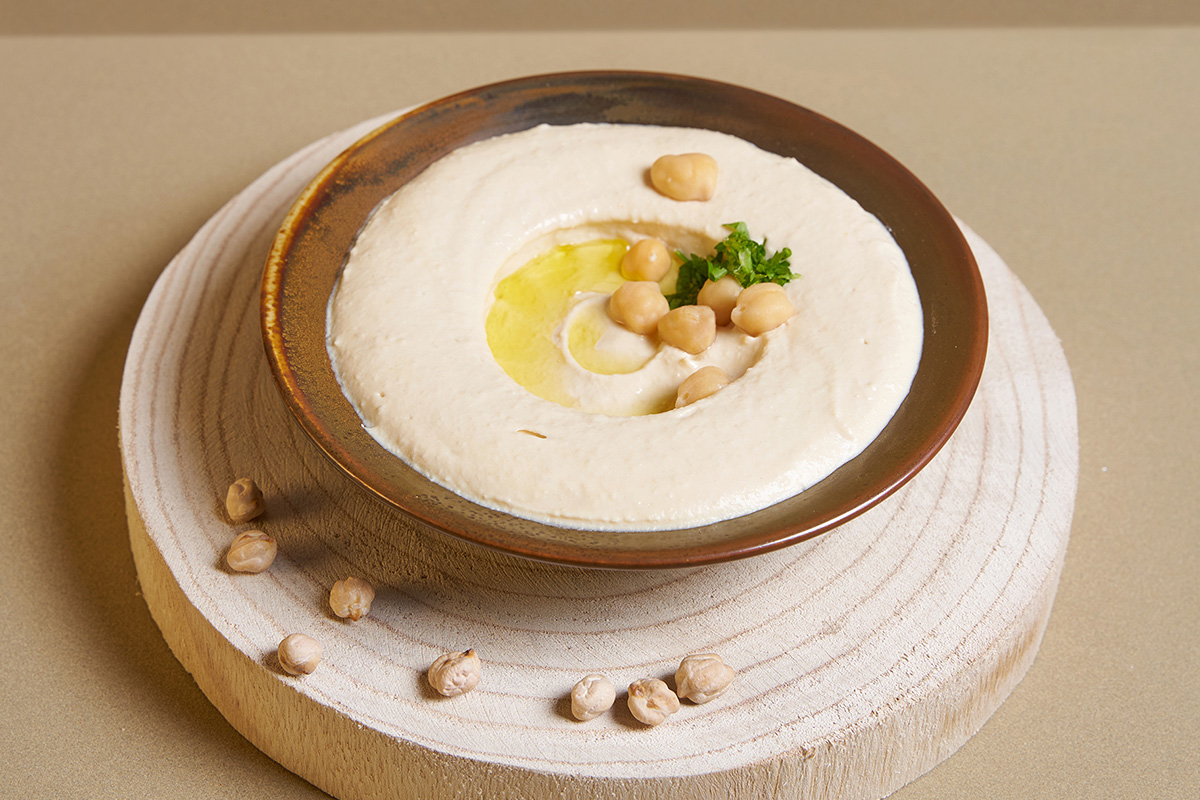 Hommos 9.00€ HOMMOS Purée de pois chiches, crème de sésame, jus de citron, huile d’olive HUMMUS Chickpea purée, sesame cream, lemon juice, olive oil حمص << Category: Mezzés froids