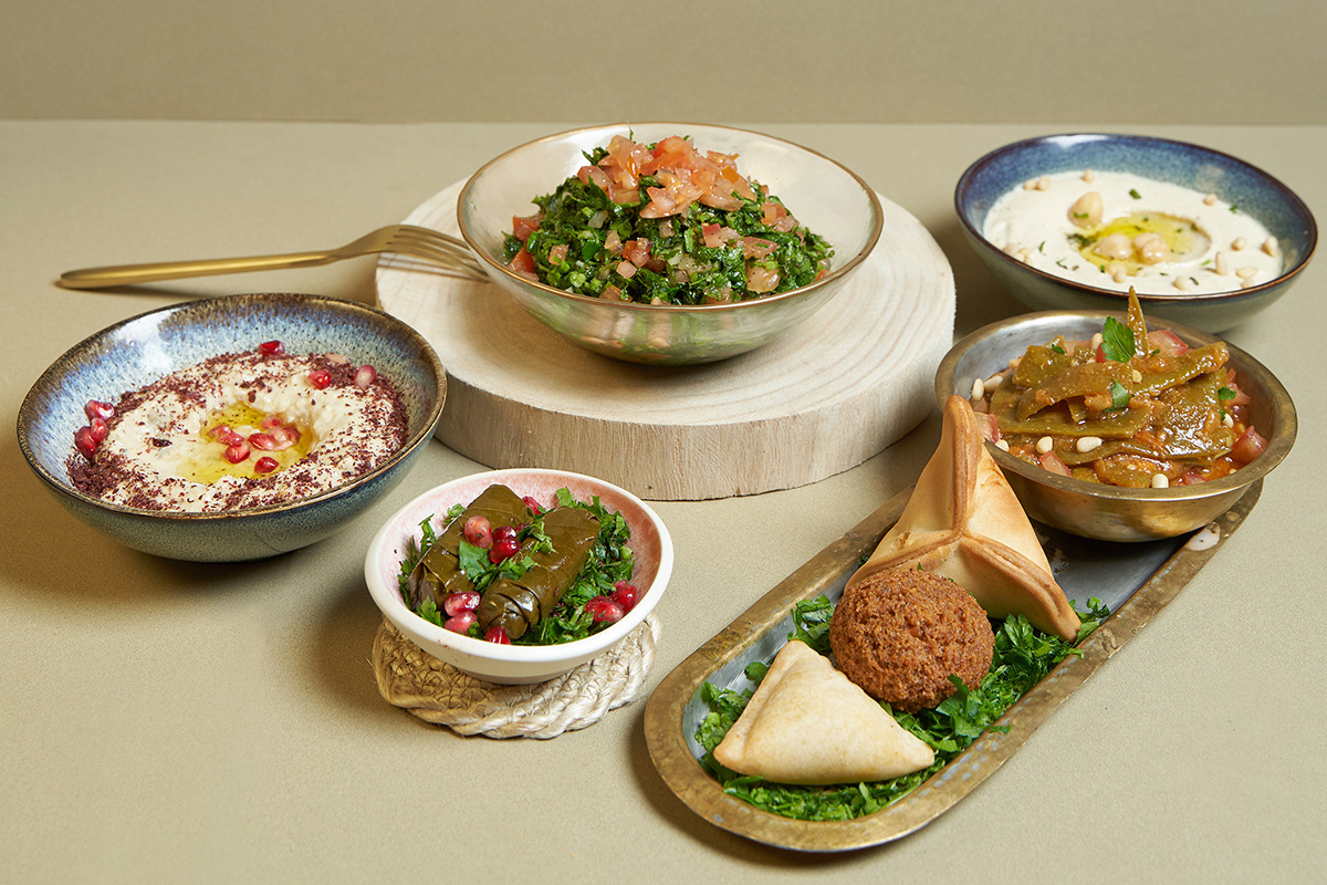 Hummus, moutabal, tabouleh, warak enab (2 pieces), fatayer, falafel, loubié bel zeit, samboussek cheese
