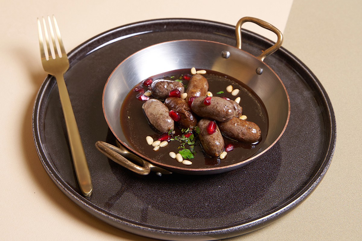 Makanek 9.00€ MAKANEK Petites saucisses de boeuf et d’agneau épicées, coriandre, jus de citron MAKANEK Small spicy beef and lamb sausages, coriander, lemon juice مقانق << Category: Mezzés chauds
