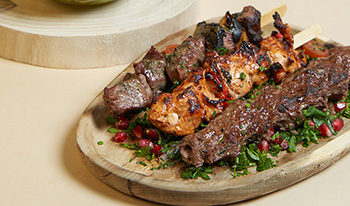Trio of lamb skewers, kefta and taouk, garlic cream, sesame tarator sauce, served with Hummus and Tabbouleh