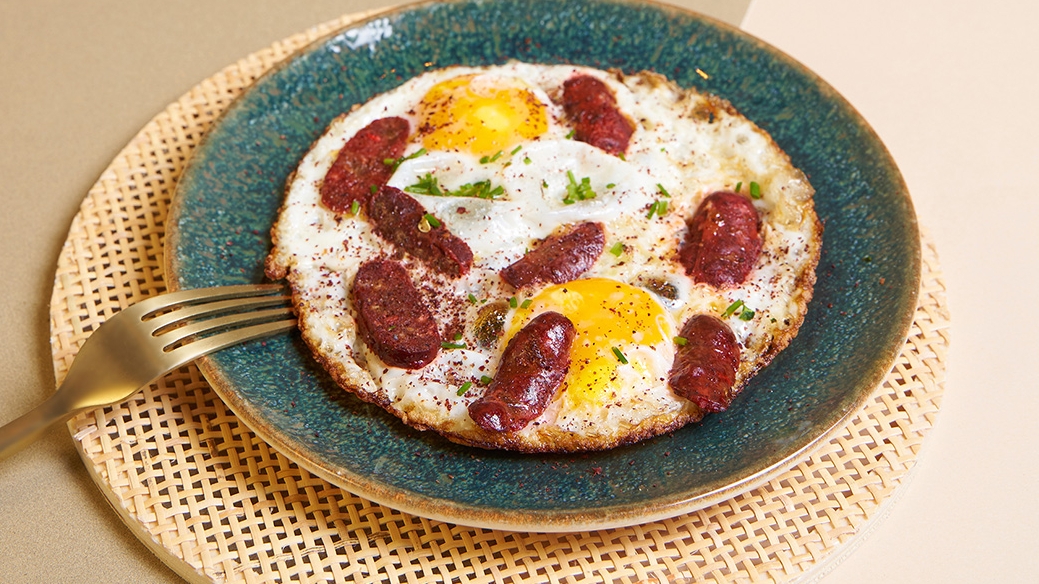 Soujouk à l’Oeuf au Plat 12.00€ SOUJOUK à L’OEUF AU PLAT Petites saucisses de boeuf épicées, mélasse de grenade, jus de citron, oeuf au plat EGG SOJOK Small spicy beef sausages, pomegranate molasses, lemon juice, fried egg سجك بالبيض المقلي << Category: Mezzés chauds